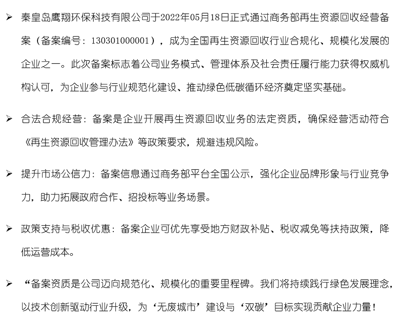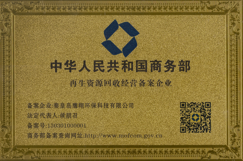 熱烈祝賀[秦皇島鷹翔環(huán)??萍加邢薰綸成為商務(wù)部再生資源回收經(jīng)營(yíng)備案企業(yè)!